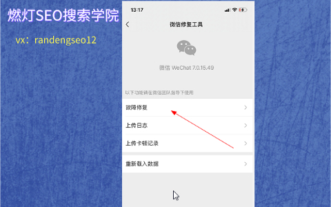 第四步:然后我们就进入了“微信修复工具”的界面,这个界面里有四个功能,我们所点击就是第一个“故障修复”剩下最后一步了,终于找到微信聊天恢复工具的最重要的一个步骤了,有时候我们的微信聊天异常丢失,很有可能是手机微信app卡顿引起的,或者书上传日志时候出现闪退的现象,这个时候先别着急去操作“上传日志”和“上传卡顿记录”设置,一定先故障修复了,先把我们微信聊天记录找回来了,再去操作。建议大家经常的更新最新版本的微信。