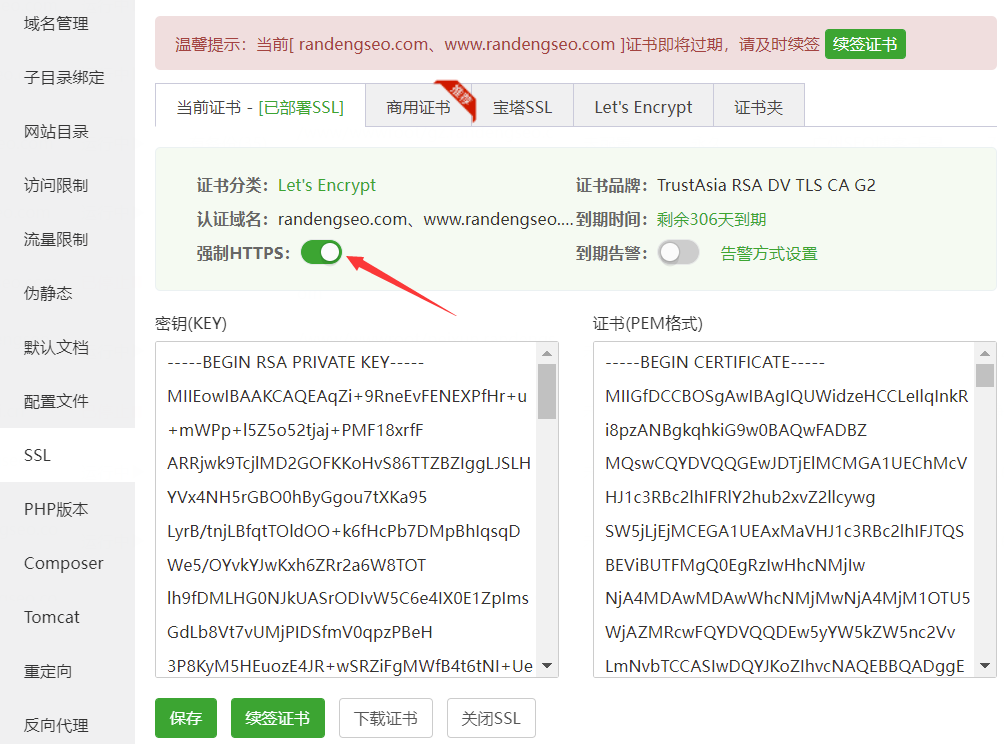 在使用宝塔面板申请ssl证书、开启网站https的时候,有个设置,“强制https”。