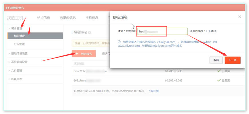 3. 进入控制面板后,点击“域名管理”——域名绑定——绑定域名,然后输入我们刚刚解析的域名的,点击确认。