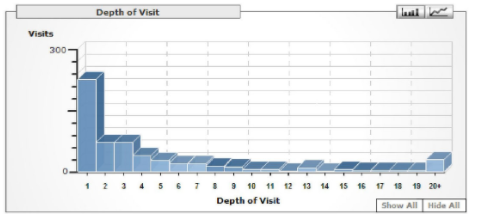 (1)独一访客追踪(Unique Visitor Tracking)下面又细分为:日访客数量、访问网页追踪、目标实现率、绝对独一访客量和访客忠诚度等。这里有一个访客忠诚度的一周活动截图。横坐标是访客来“长城探险俱乐部”网站的次数,纵坐标是人数。可以看到,的确有一群访客眷恋这个网站,他们总共来访甚至有100次以上。但是,99.9%的都是访问一次,如图所示。