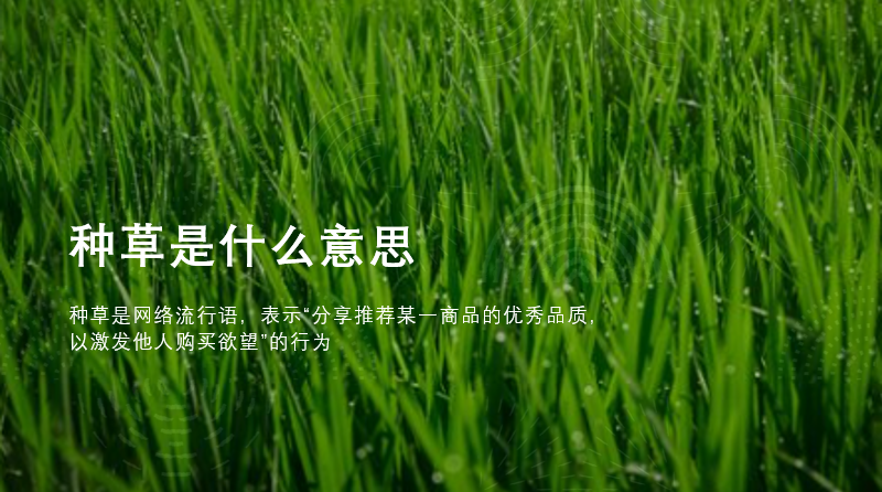 种草是网络流行语,表示“分享推荐某一商品的优秀品质,以激发他人购买欲望”的行为,或自己根据外界信息,对某事物产生体验或拥有的欲望的过程;也表示“把一样事物分享推荐给另一个人,让另一个人喜欢这样事物”的行为,类似网络用语“安利”的用法;还表示一件事物让自己从心里由衷地喜欢。