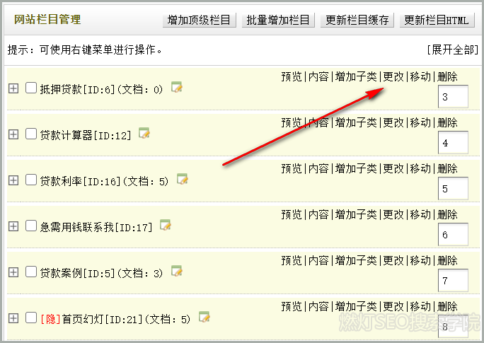 第二步:到织梦网站饿管理,选中一个栏目点击更改。