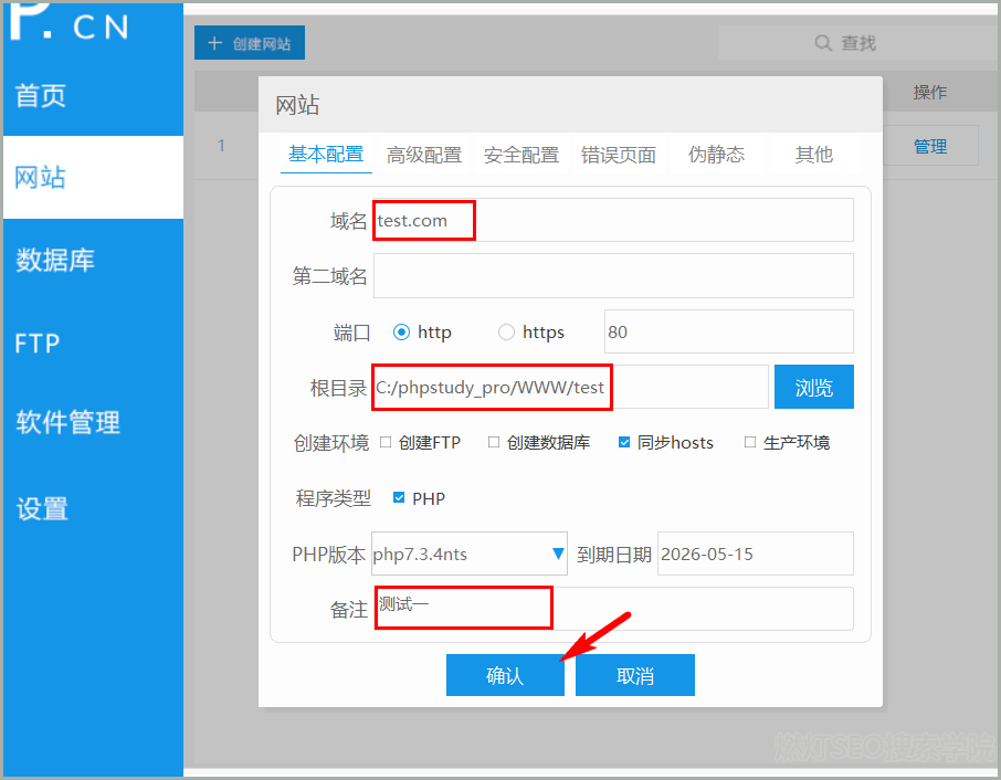第六步:然后回到 phpstudy 软件界面,点击『网站 > 基本设置 > 浏览(根目录选择刚刚创建的文件)> 备注自定义 > 确定』
